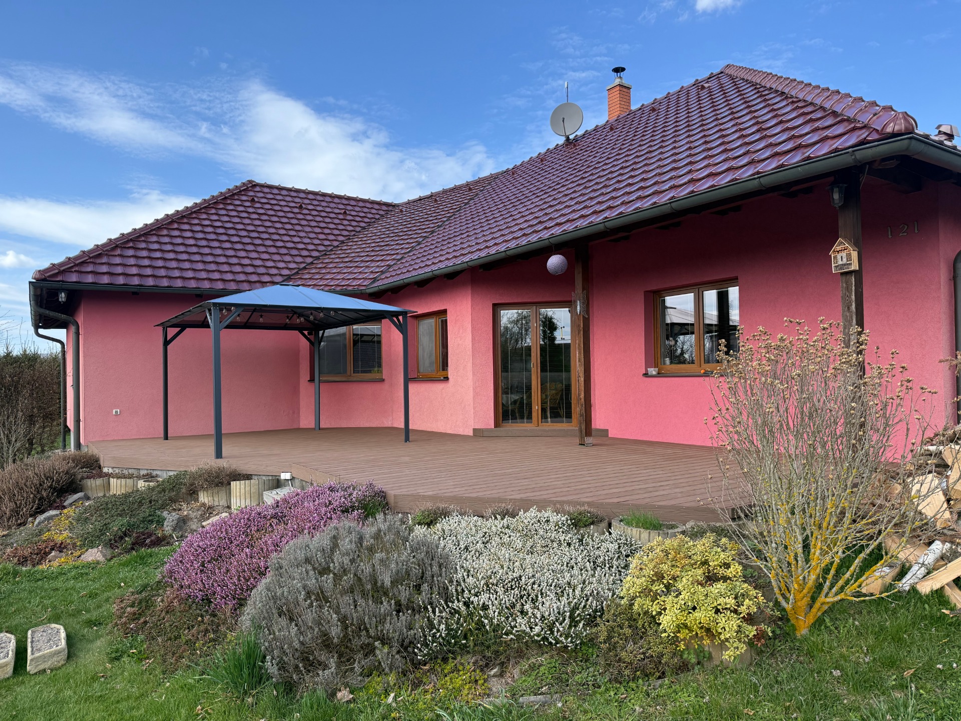 Původně betonová terasa u rodinného domu, rozšířena dřevěnou konstrukcí. Pod Terasou ponechán úložný prostor přístupný z více stran. Terasa kompletně obložena modřínovými prkny v profilu rhombus. Pochozí plocha z modřínových prken, vše napuštěno bezbarvým olejem. Pozinkované sloupky vyplněny nerezovými lanky a doplněné modřínovým madlem. Plocha terasy cca 5 x 5 m.