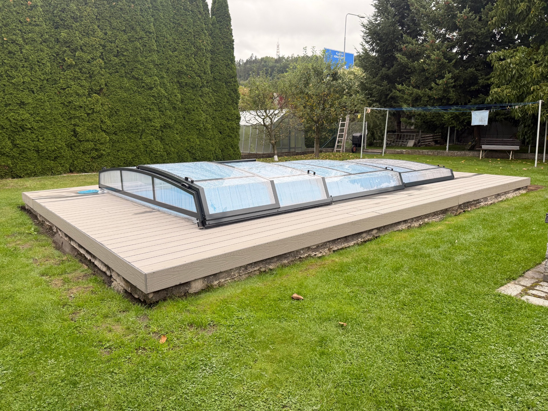 Terasa kolem bazénu z WPC prken s moderním designovým zastřešením, které zároveň šetří Váš prostor. Barevné provedení Dark Grey.
